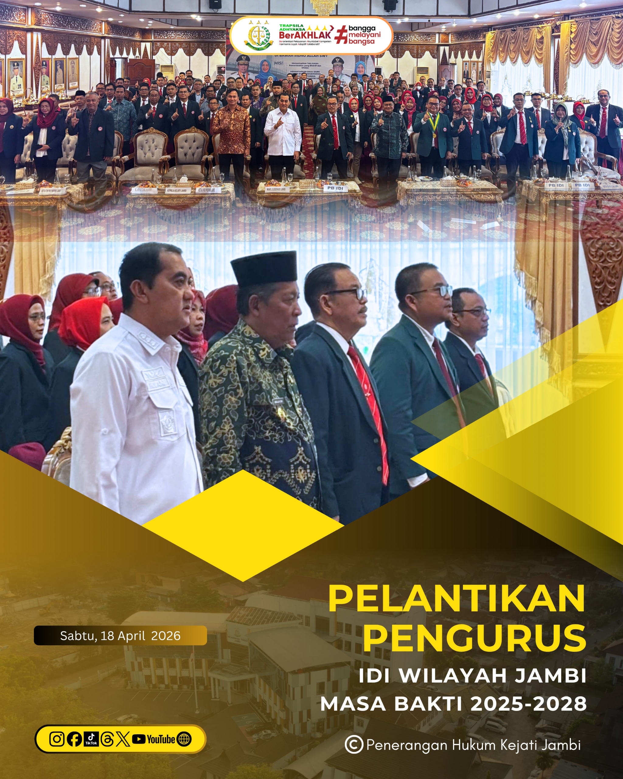 Asisten Bidang Intelijen Kejaksaan Tinggi Jambi, Dr. Muhammad Husaini, S.H., M.H., menghadiri kegiatan Pelantikan Pengurus Ikatan Dokter Indonesia (IDI) Wilayah Jambi Masa Bakti 2025–2028 yang dilaksanakan pada Sabtu (18/04/2026).