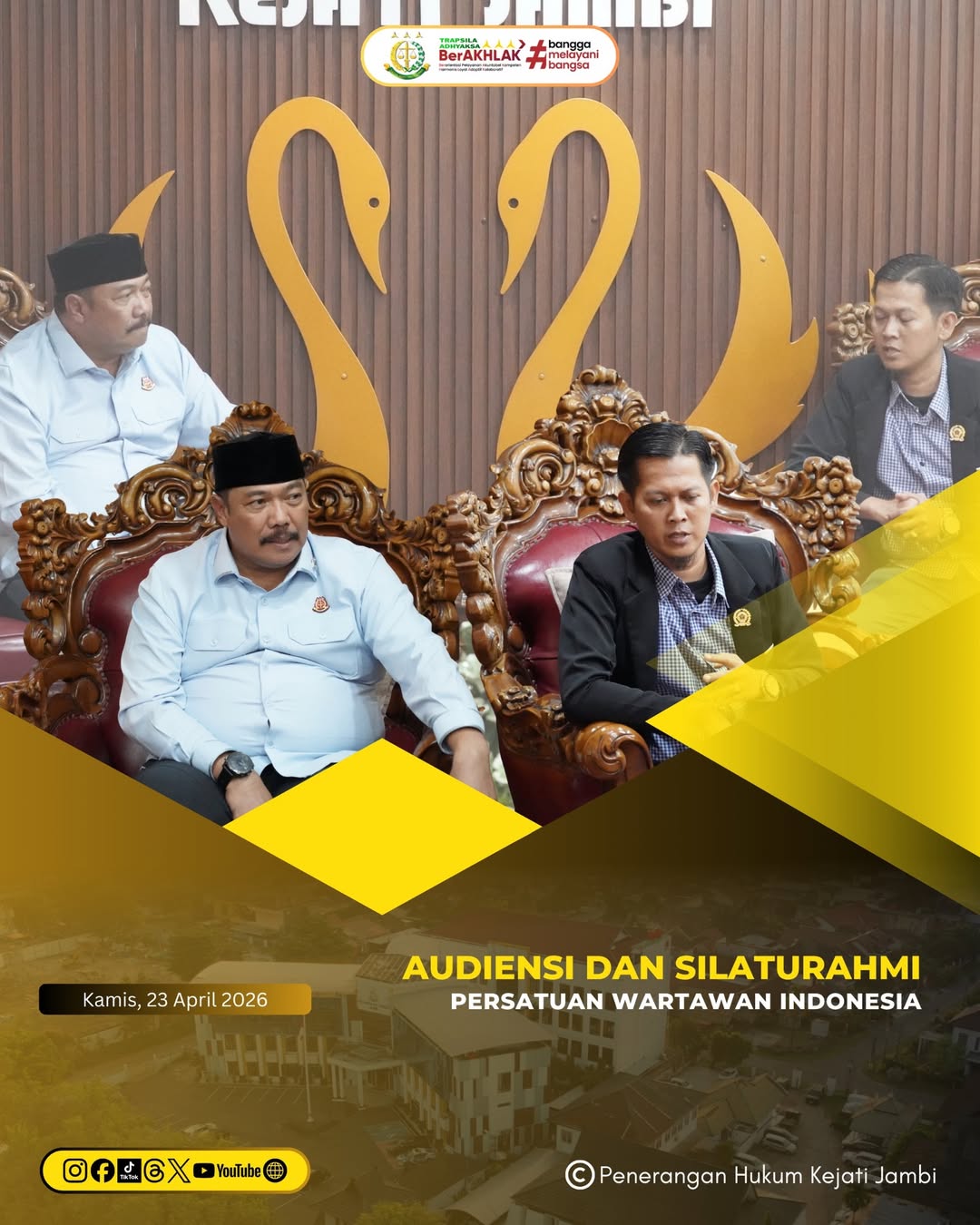 Kepala Kejaksaan Tinggi Jambi, Sugeng Hariadi, S.H., M.H., menerima audiensi dan silaturahmi dari Persatuan Wartawan Indonesia (PWI) pada Kamis (23/04/2026).