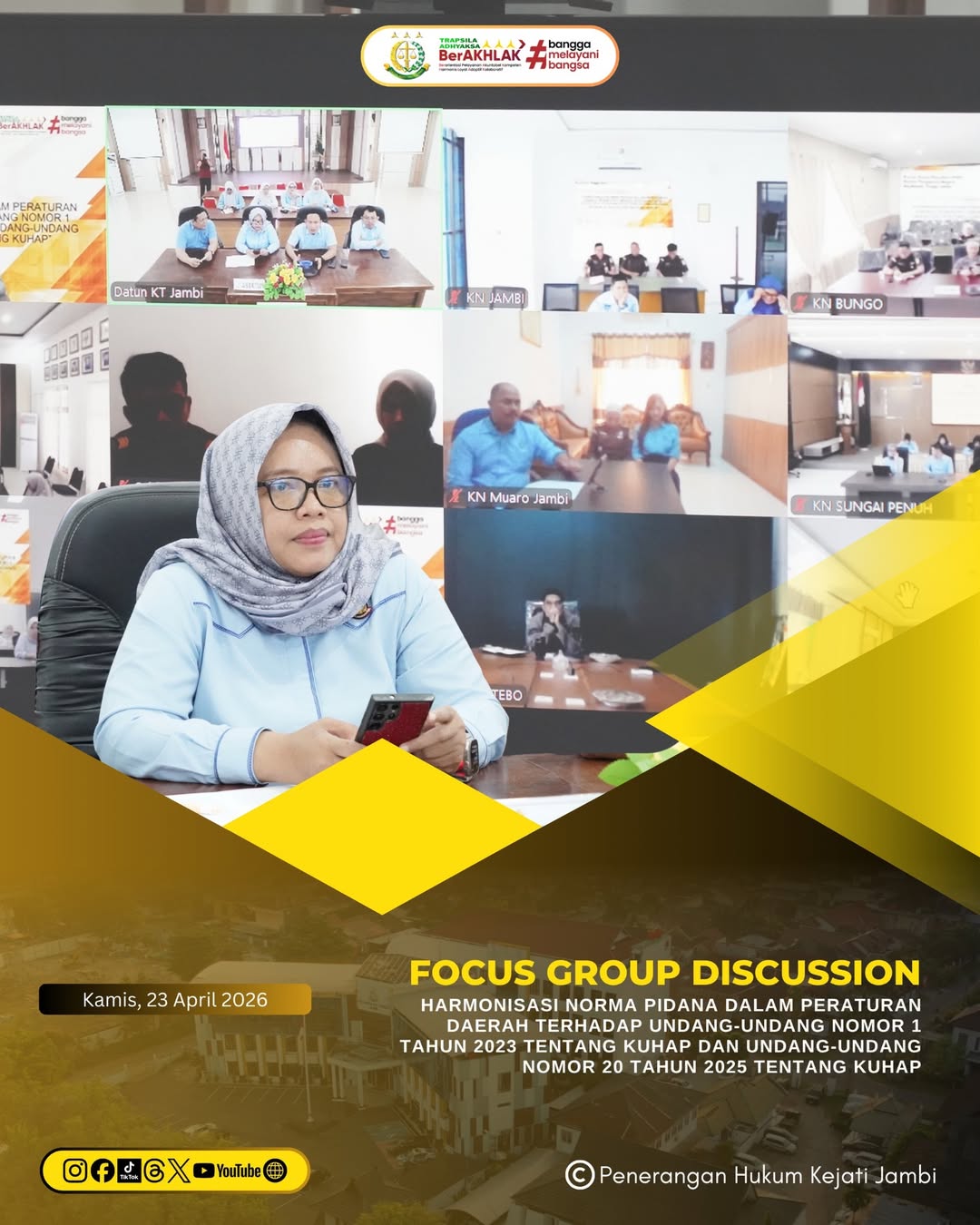 Asisten Bidang Perdata dan Tata Usaha Negara Kejati Jambi Dr. Ika Mauluddhina, S.H., M.H., melaksanakan kegiatan Focus Group Discussion (FGD) yang dilaksanakan secara daring pada Kamis (23/04/2026).