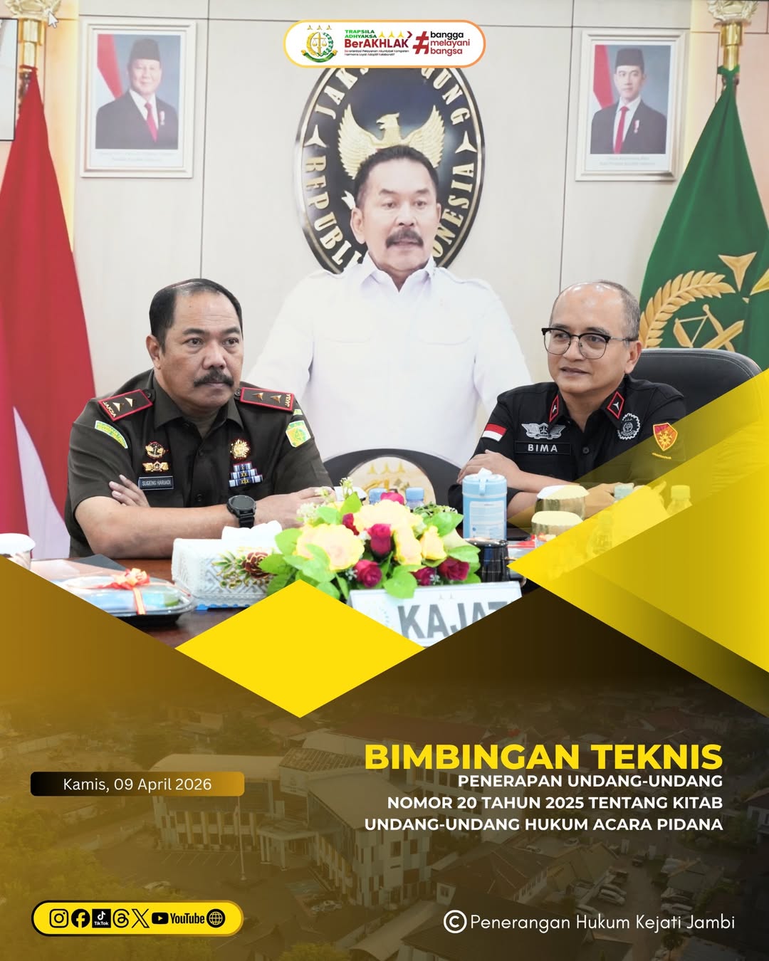 Kepala Kejaksaan Tinggi Jambi Sugeng Hariadi,SH.,MH didampingi Wakajati dan Para Asisten serta Jaksa Fungsional mengikuti kegiatan Bimbingan Teknis Penerapan Undang-Undang Nomor 20 Tahun 2025 tentang Kitab