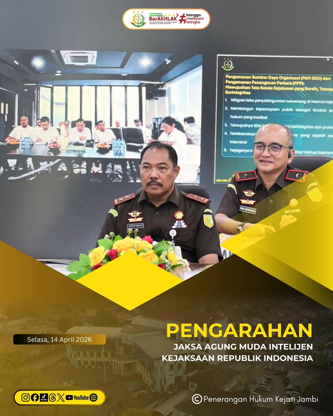 Kepala Kejaksaan Tinggi Jambi, Sugeng Hariadi, S.H., M.H., didampingi Wakajati Jambi, Dr. Bima Suprayoga, S.H., M.Hum., beserta Para Asisten, Para Koordinator dan Pejabat Eselon IV dilingkungan Kejaksaan Tinggi Jambi mengikuti pengarahan Jaksa Agung Muda Bidang Intelijen Kejaksaan RI Prof. Dr. Reda Manthovani, S.H., LL.M., melalui sarana video conference pada Selasa (14/04/2026).