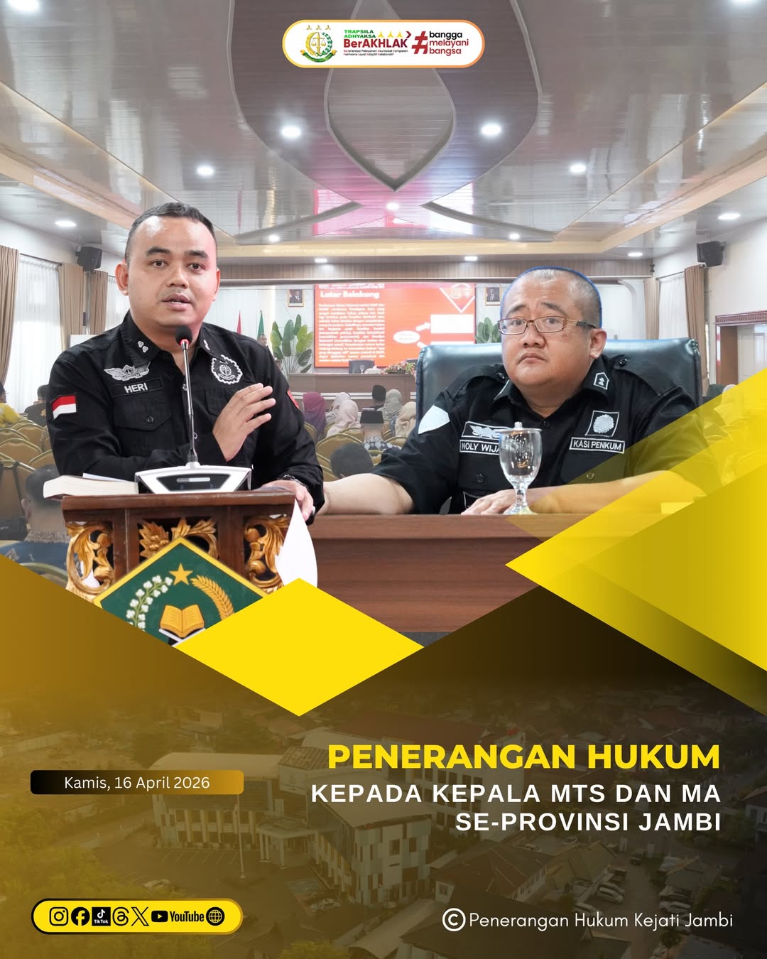 Kepala Seksi Tindak Pidana Terhadap Orang dan Harta Benda Bidang Pidum Kejati Jambi, Muhammad Heriyadi, S.H., M.H., menjadi narasumber dalam kegiatan penerangan hukum kepada Kepala Madrasah Tsanawiyah (MTs) dan Madrasah Aliyah (MA) se-Provinsi Jambi yang dilaksanakan pada Rabu (22/04/2026) Bertempat di Kanwil Kemenag Provinsi Jambi.