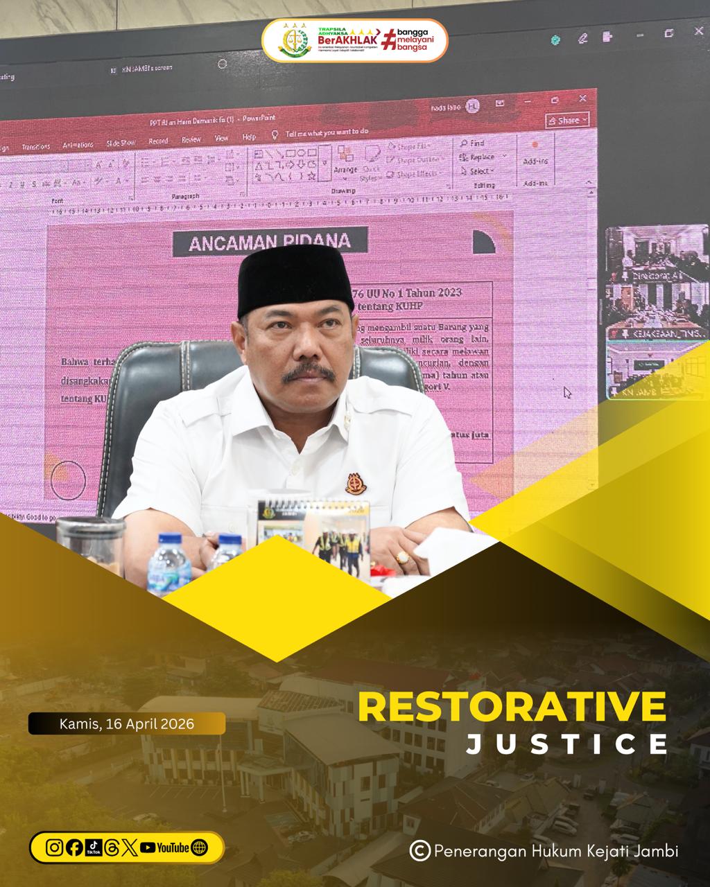 Kepala Kejaksaan Tinggi Jambi Sugeng Hariadi, S.H., M.H., didampingi Aspidum serta para Kasi pada Bidang Pidum Kejati Jambi,mengikuti kegiatan ekspose pengajuan mekanisme keadilan restoratif. Kegiatan tersebut dilaksanakan secara virtual melalui Zoom Meeting bersama jajaran Jaksa Agung Muda Tindak Pidana Umum Kejaksaan Agung Republik Indonesia pada Kamis (16/04/2026).